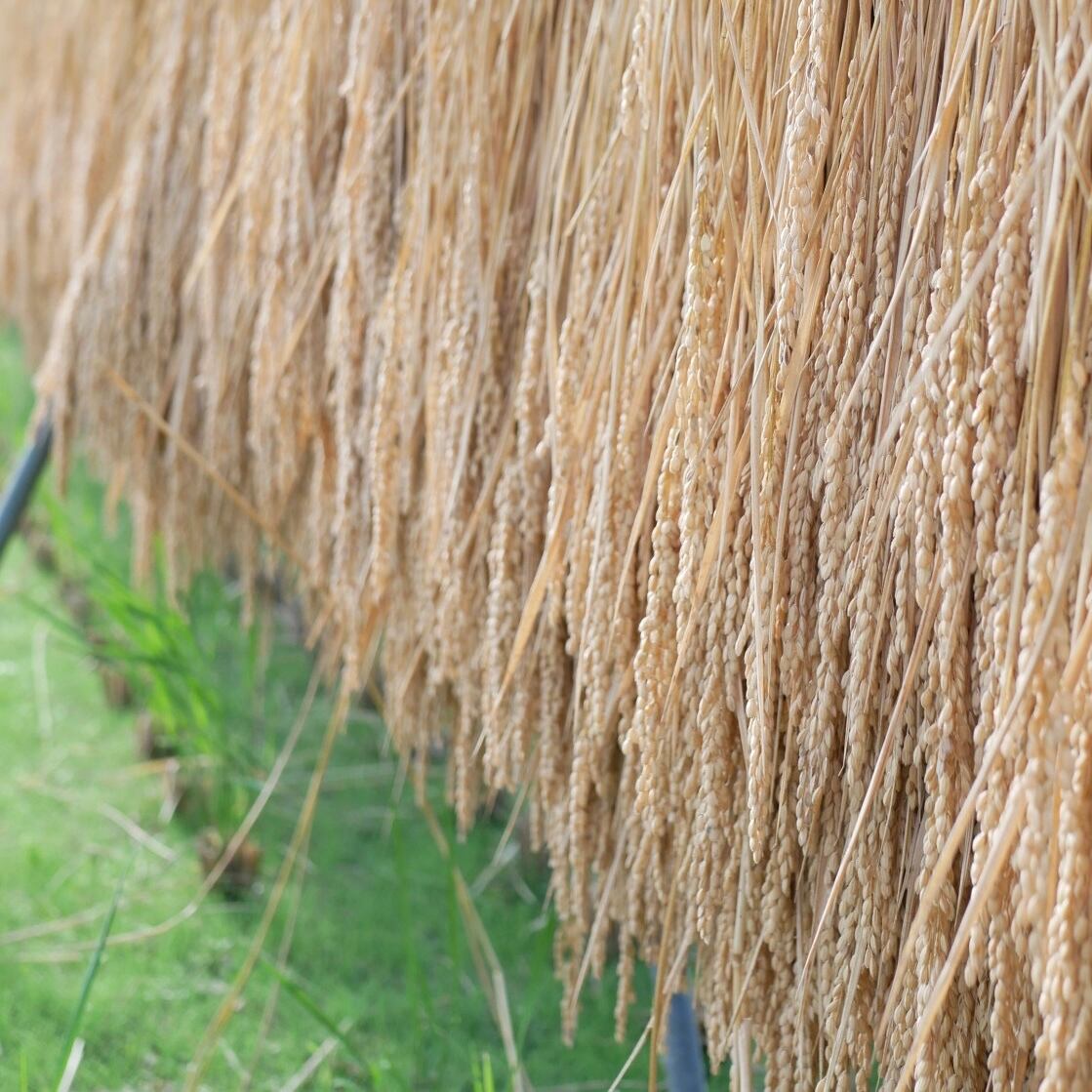刈り取り後はハザ棒にかけて、じっくり天日干しをします。機械で乾燥させるのではなく、天日にあて自然に乾燥させることで、稲の茎や葉に残った養分が米に蓄積され、旨みが増していきます。